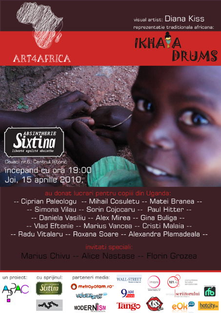 Thursday, 15th of April, the Romanian artists are donating pictures with the theme Africa, and all those who are willing to give a hand are invited to auction. All the money will be donated to the organization Busabaga Lugala Community Development in order to sustain the continuation of their activity. For those that can not afford to purchase a drawing of an artist, the organizers prepared some alternatives: ginger bread, postal cards and traditional African items can be bought at reasonable prices, the money resulting from these activity going for the same cause.
