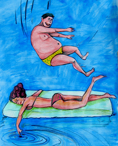 Foarte haios desenul, fata va privi undele de sub apa, daca are bafta sa nu-i cada in cap saritorul. Imi plac si costumele de baie !