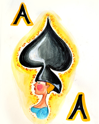 Dama de pica este mereu binevenita. Cumparatorul acestui desen este cu siguranta norocos, pentru ca atunci cand desenam, am aruncat niste praf de noroc in culoarea galben si am pictat cu ea in jurul reginei.