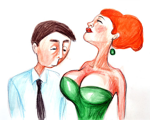 “Păi, doamnă, dacă vii cu superbii-ţi sâni la vedere, de ce te superi pe mine că nu mă pot opri din holbat? Spune şi tu! Nu mai bine, mă iei de braţ şi mergem îmtrună la o cafeluţă? E vineri, şefu’ nu-i aici. Îmi mai povesteşti despre sâni… pardon, despre rapoartele de ieri!”